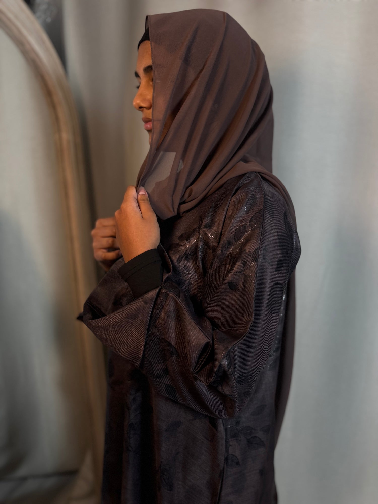 Elegant closed abayas crafted from soft, flowing fabric, featuring a flattering V-neckline and subtle slit sleeves for ease and movement. Designed with a refined leaf pattern and a modest silhouette, perfect for timeless everyday or occasion wear.